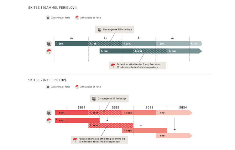 I dag har vi det, vi kalder for forskudt ferie. Du opsparer feriedage i et helt kalenderår, og så afvikler du ferie i et skævt ferieår, fra 1. maj til 30. april. Det er det, der bliver ændret nu.
