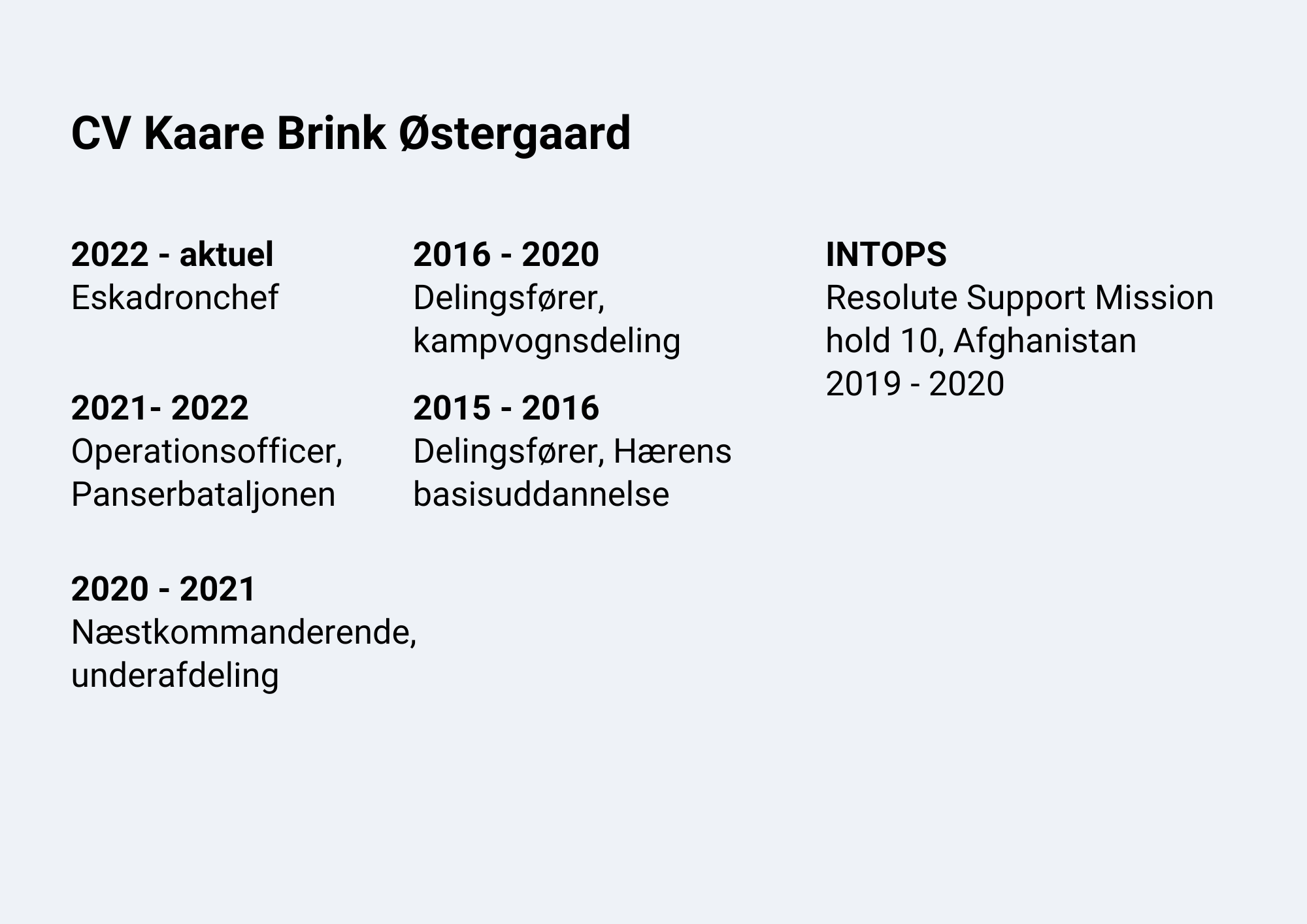 Kaare Brink Østergaard, 34 år. HB-medlem Hæren. Eskadronchef, 3 Kampvognseskadron (Lilje-eskadronen), Panserbataljonen, Jydske Dragonregiment.